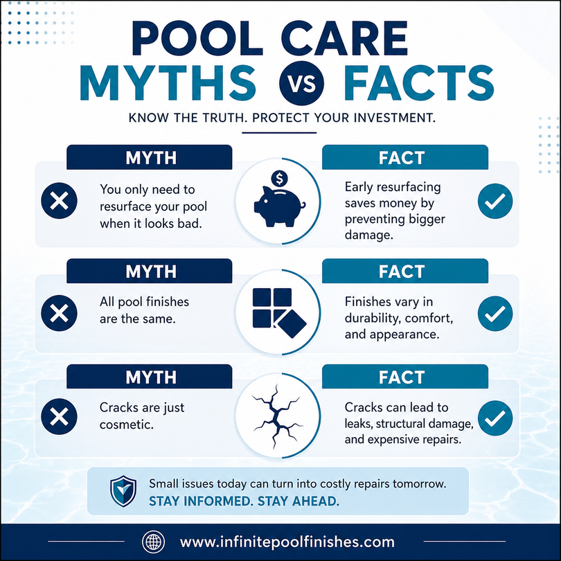 Pool Care Myths vs Facts | Pool Resurfacing & Renovation Discover the truth behind common pool care myths and facts. 👉 www.infinitepoolfinishes.com Learn how early pool resurfacing, proper maintenance, and identifying cracks can save you from costly repairs. Not all pool finishes are the same—choose the right one for long-lasting results.Explore expert pool renovation and finishing services today