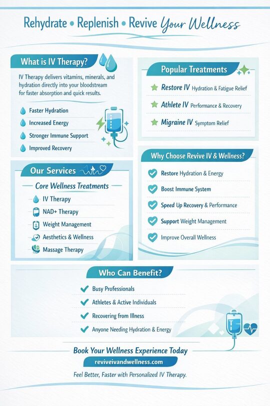 Revive IV and Wellness provides professional IV therapy to boost hydration, energy, and overall health. With personalized treatments and expert care, they help improve recovery, strengthen immunity, and support your wellness goals.